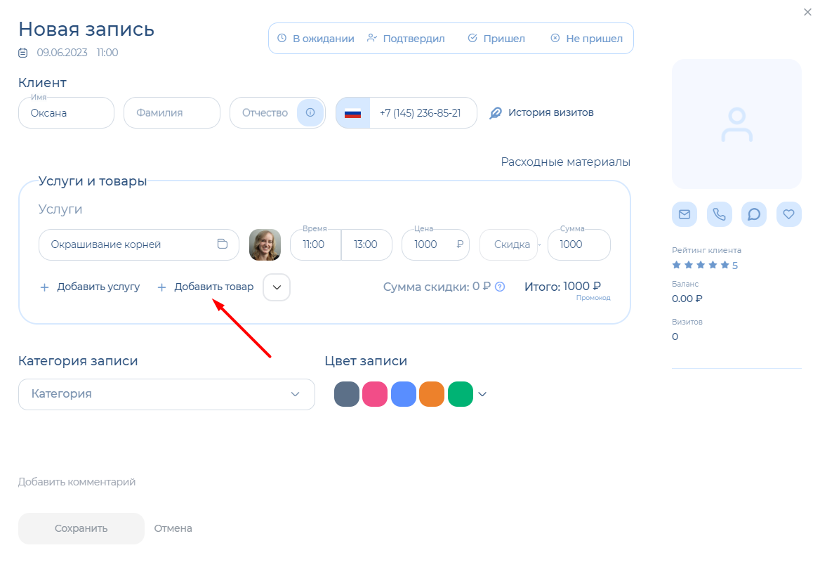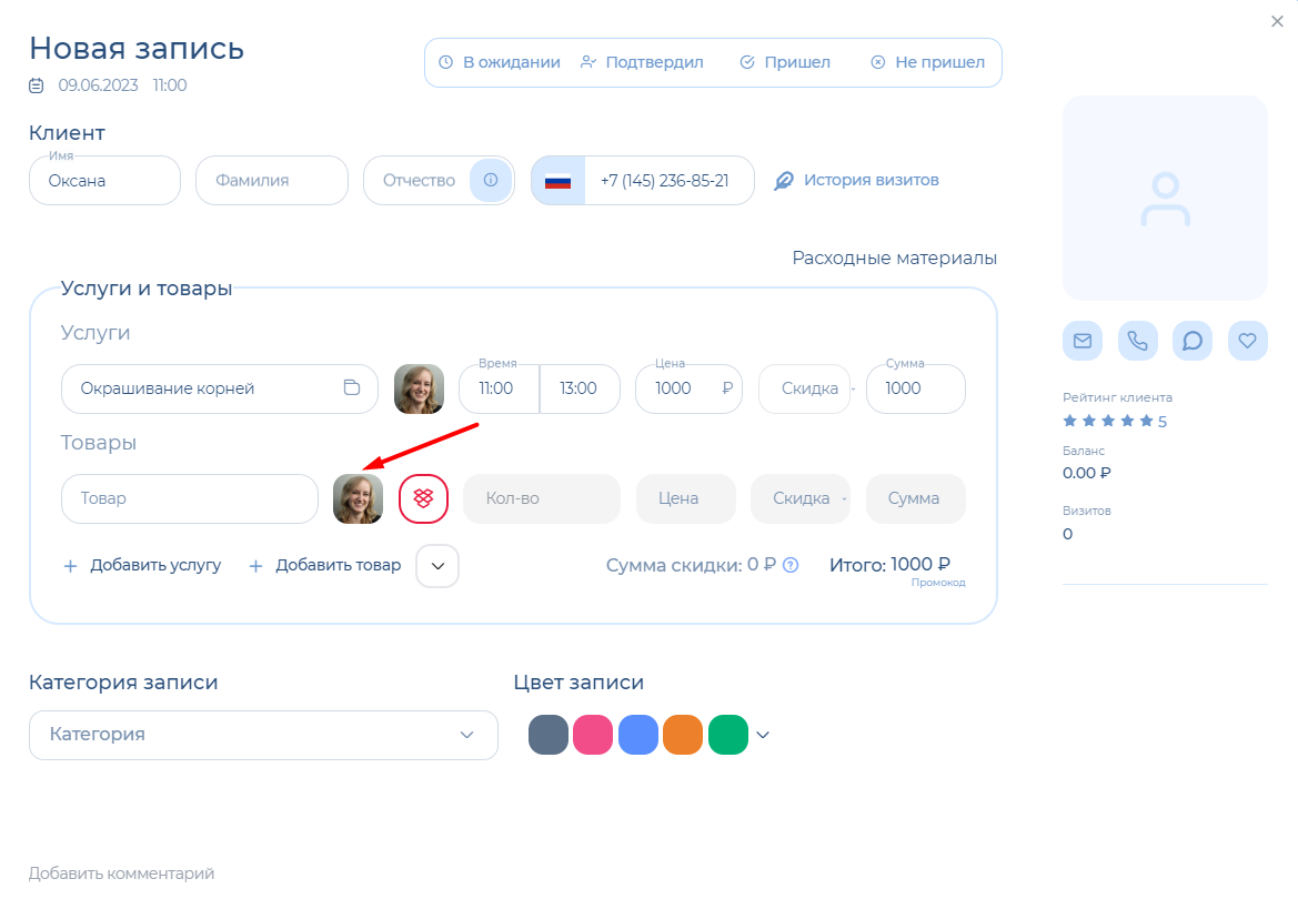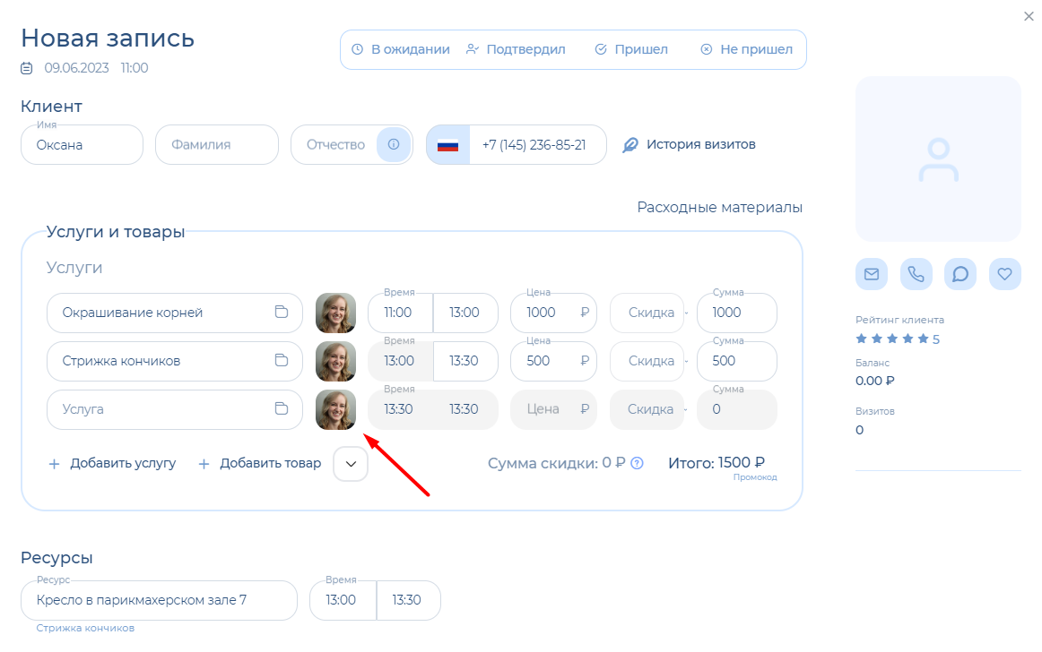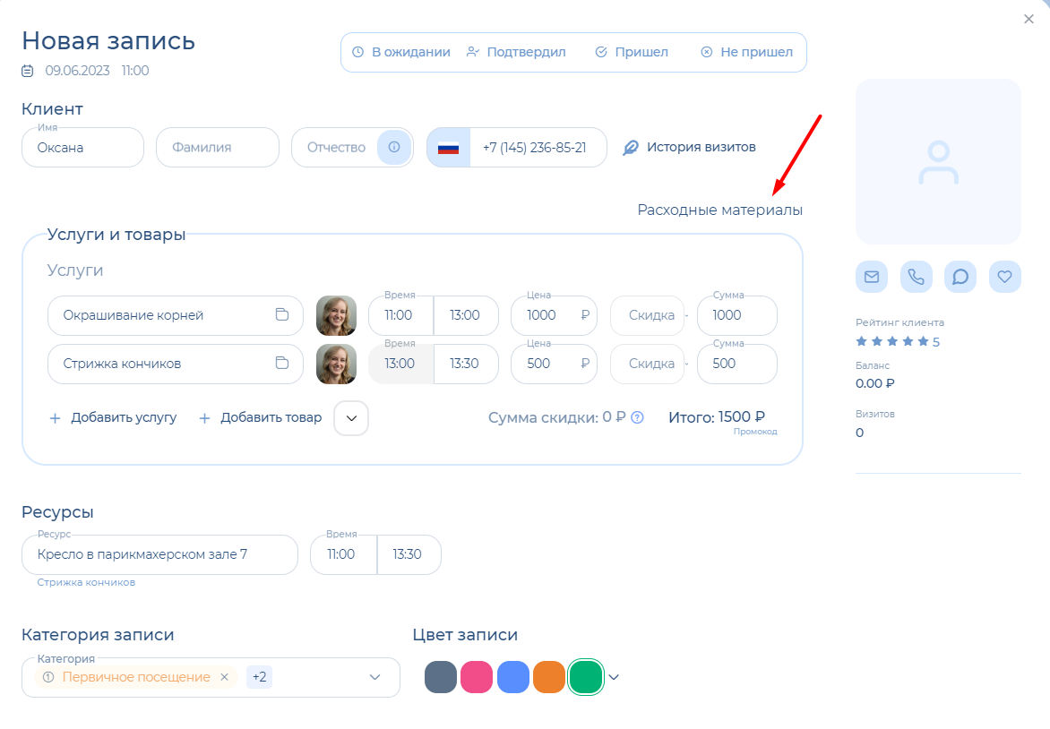 Вы можете добавить расходные материалы в визит, к примеру, краску для волос или одноразовое полотенце. Для этого нажмите на «Расходные материалы».
