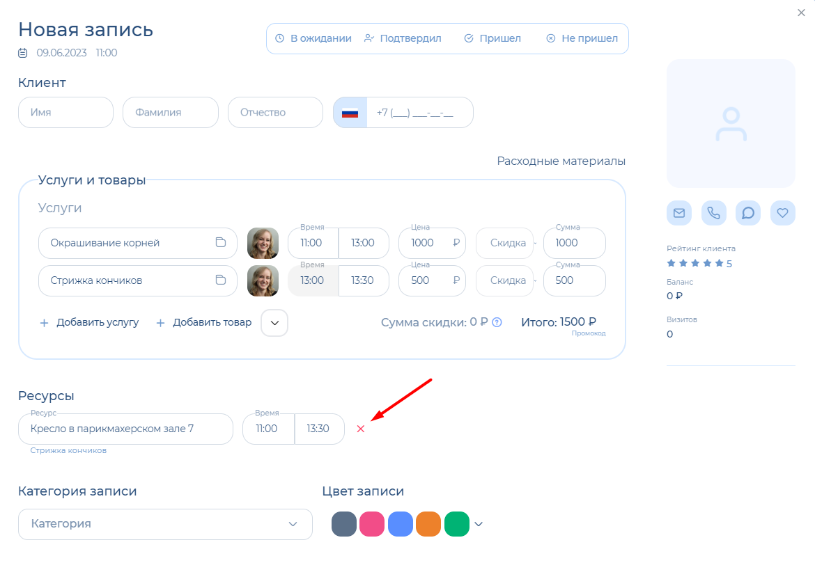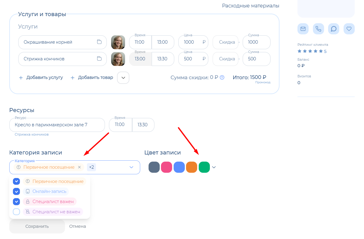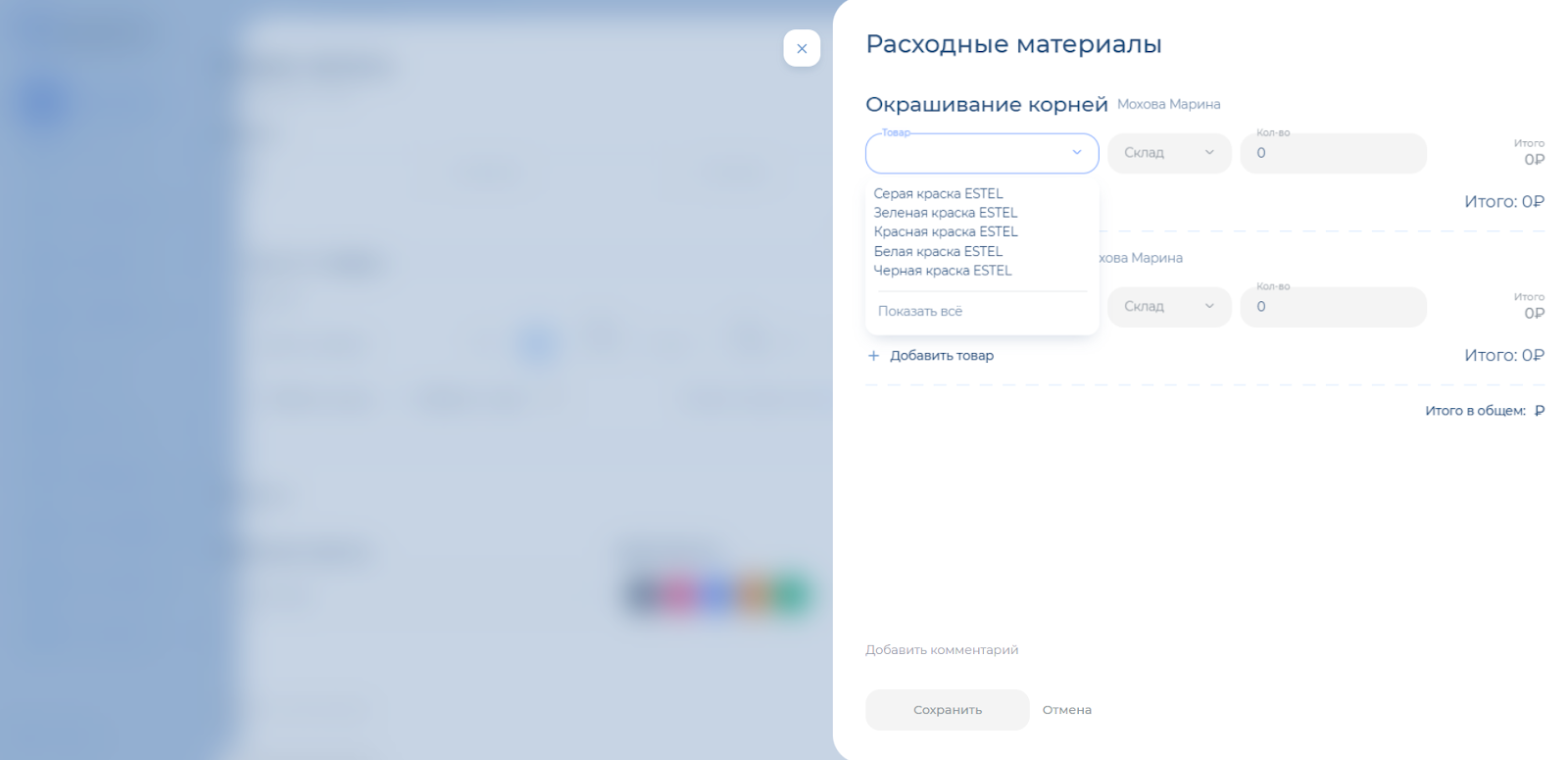 Вы можете добавить расходные материалы в визит, к примеру, краску для волос или одноразовое полотенце. Для этого нажмите на «Расходные материалы».