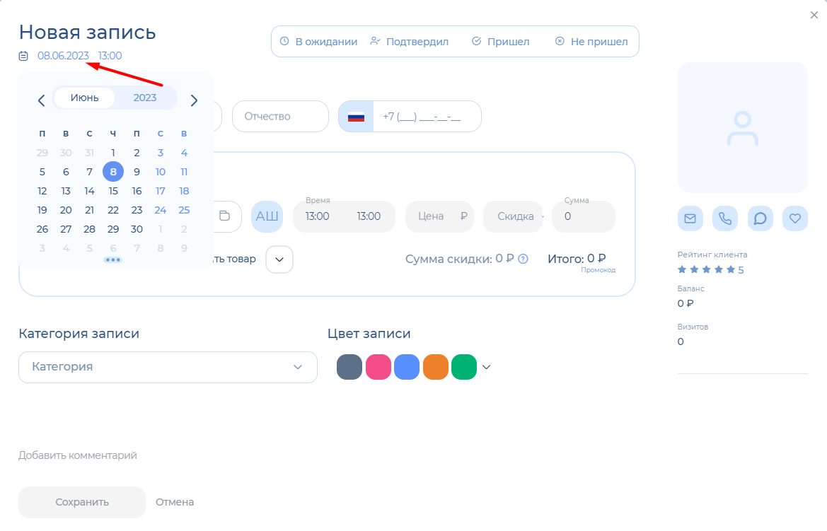 Вы можете изменить дату визита, кликнув на нее. Просто выберите нужный день в открывшемся календаре.