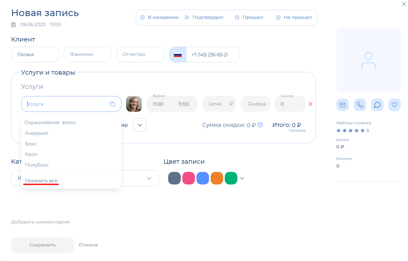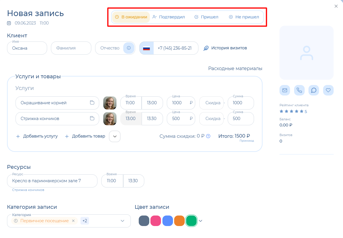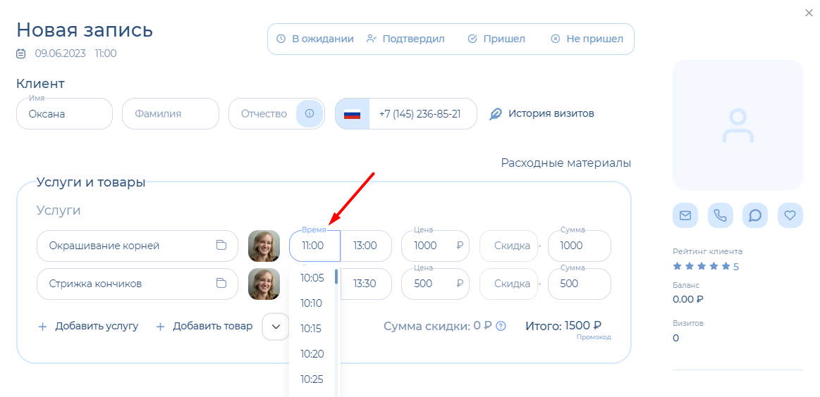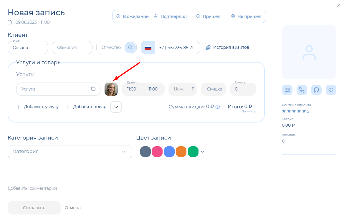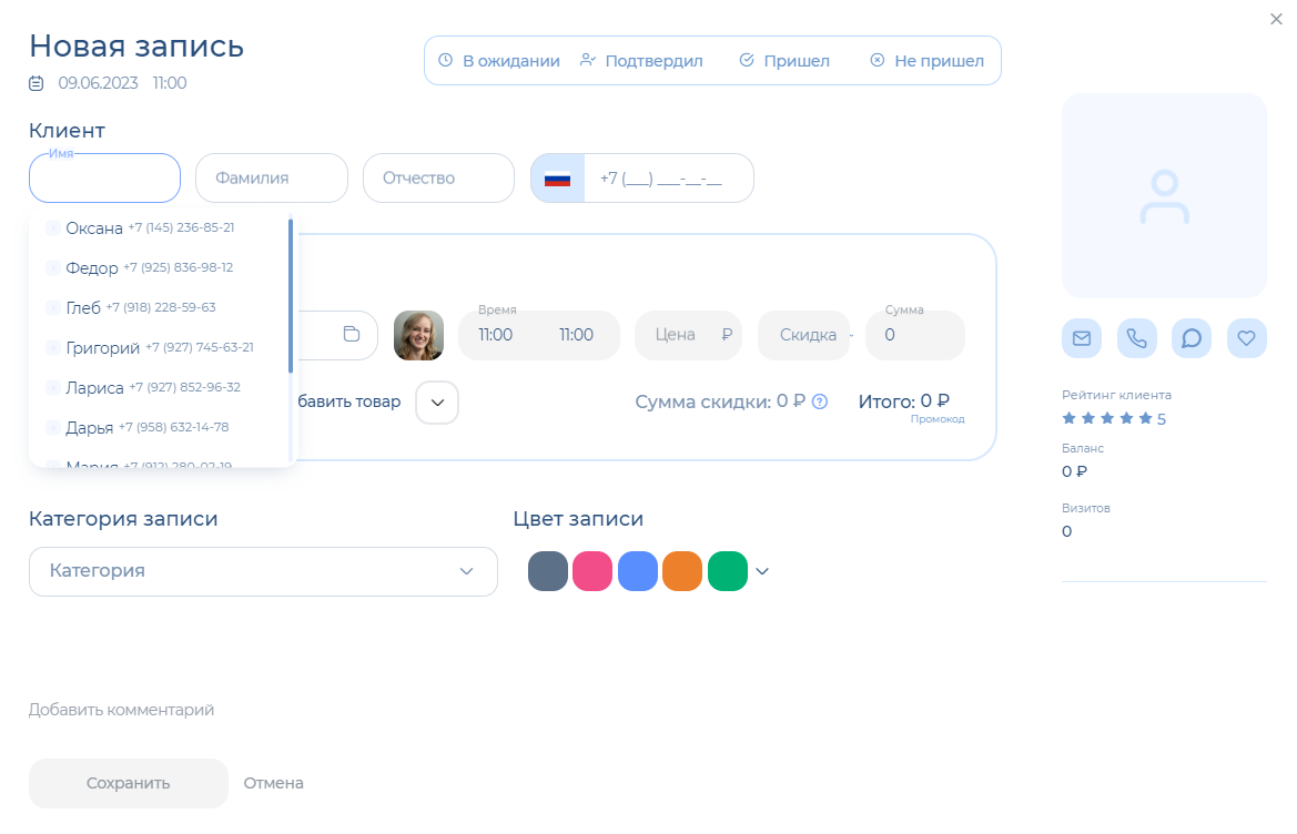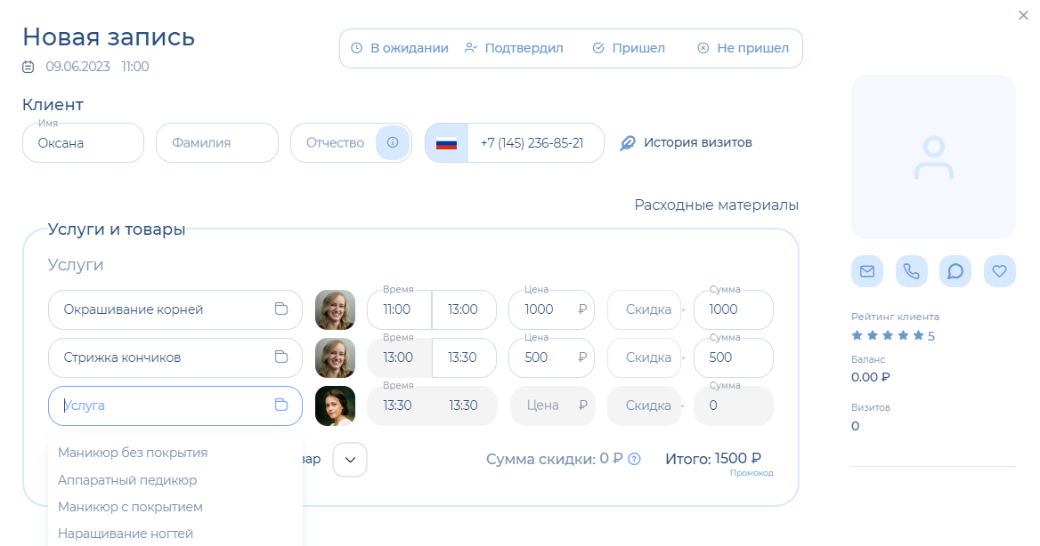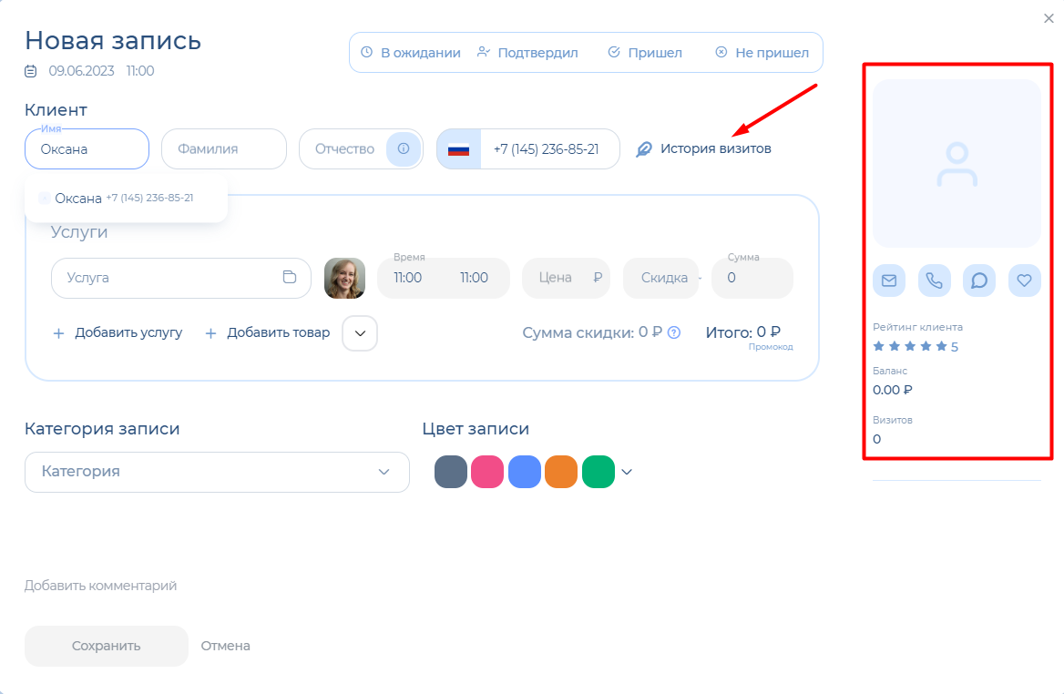Справа отобразится фото клиента (если есть), рейтинг, баланс и число визитов. Оттуда же вы сможете позвонить или написать клиенту, кликнув на соответствующую иконку. Также вы можете посмотреть историю визитов клиента.