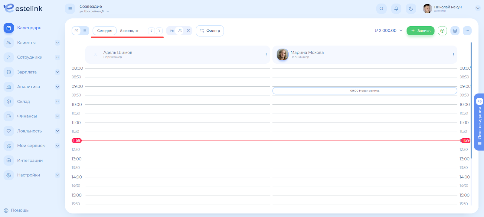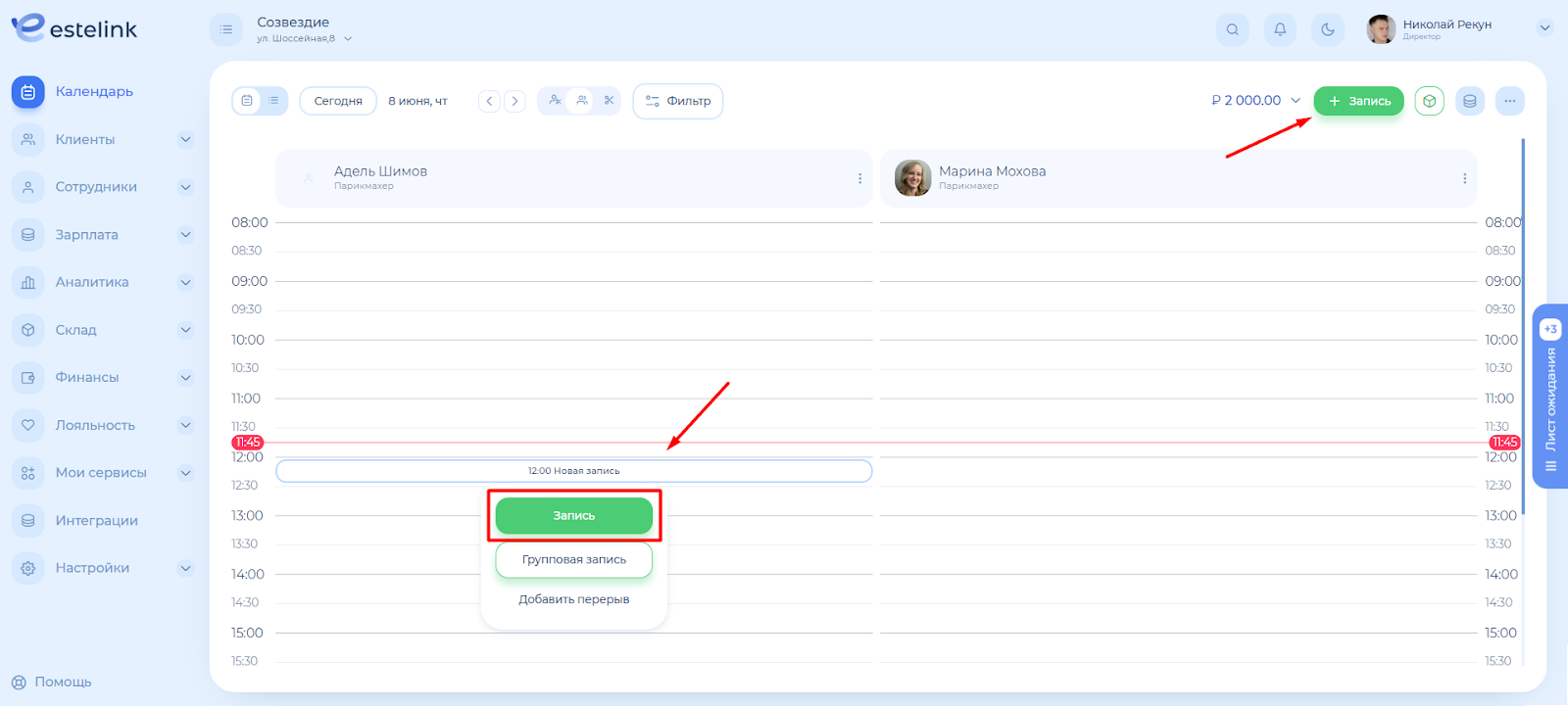 Нажмите на «Запись» в правом верхнем углу. Либо наведите мышку на область календаря под именем нужного специалиста и примерно на нужное время, появится всплывающее окно «Новая запись». Нажмите на него и выберите пункт «Запись».