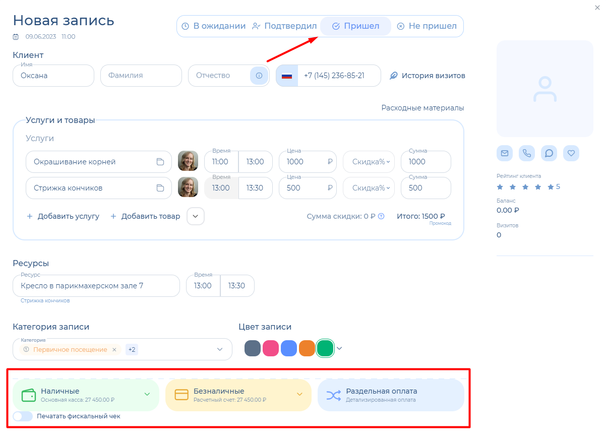 «Пришел» – клиент пришел, визит состоялся. После выставления этого статуса появляется возможность провести оплату визита, а в профиле клиента и в календаре отображается долг на сумму всех услуг и товаров в визите. Он пропадает, когда проводится оплата по заказу.