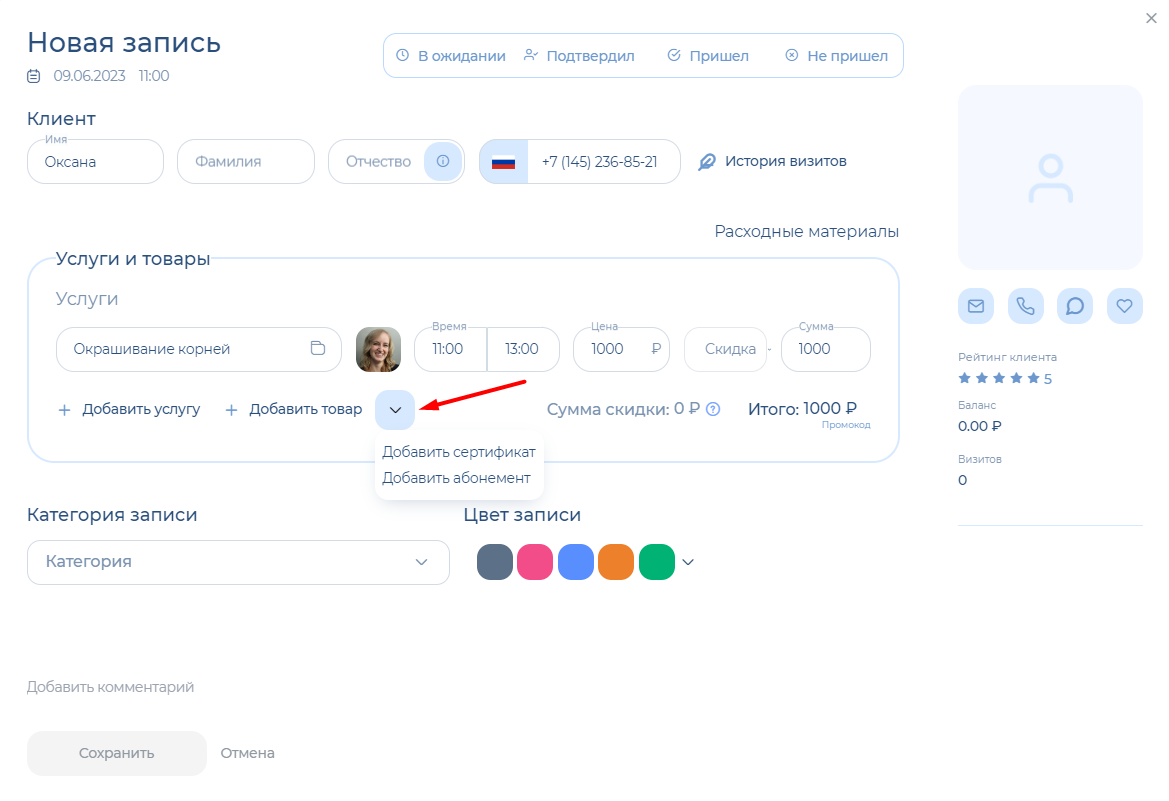 Аналогично товару можно добавить сертификат или абонемент, кликнув на стрелочку рядом с «Добавить товар».