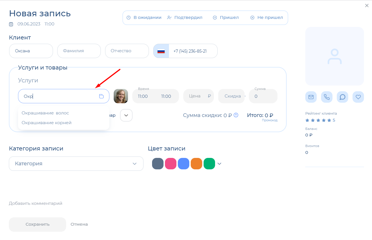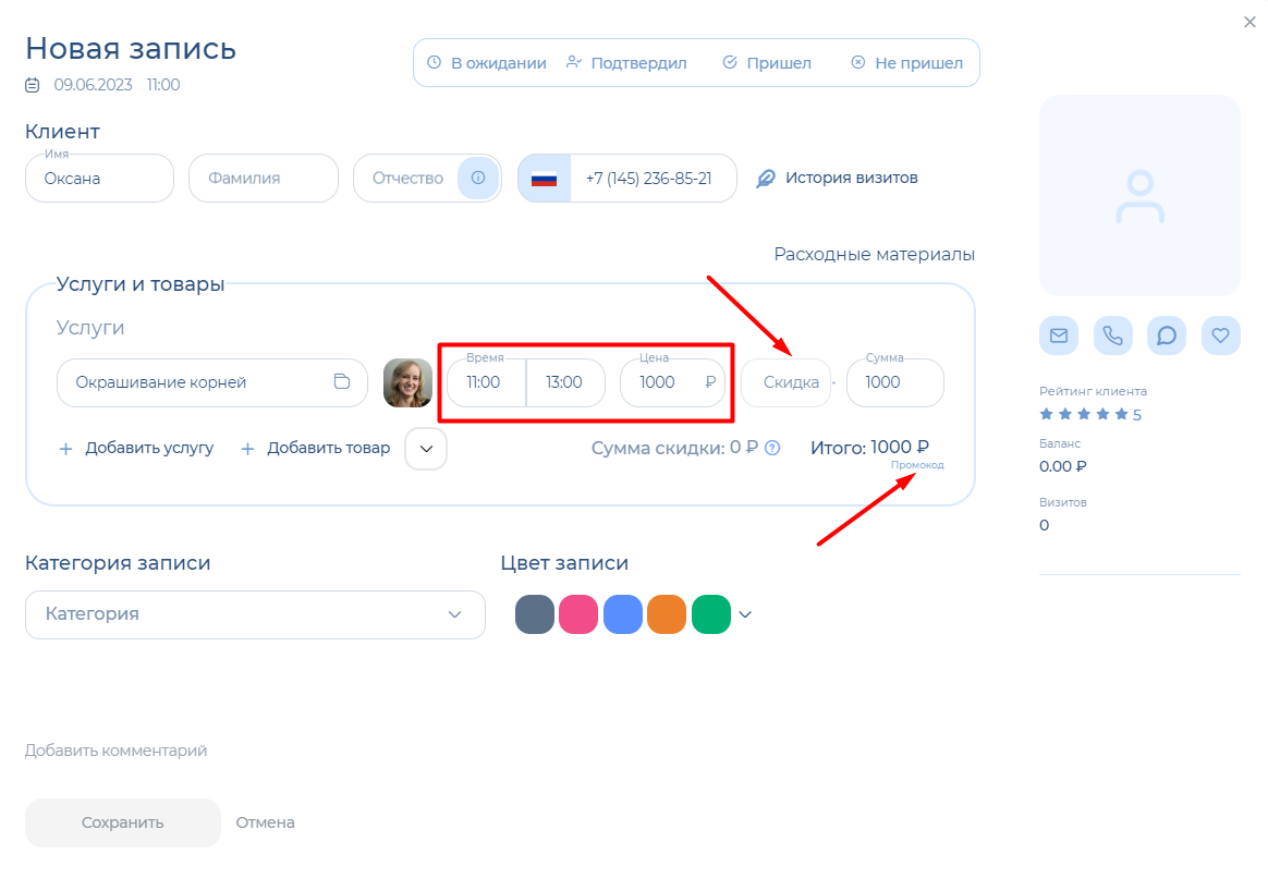 Если клиент новый, то заполните его имя, номер телефона и, по желанию, фамилию и отчество – будет создан новый профиль клиента. Подробнее о клиентах смотрите здесь.