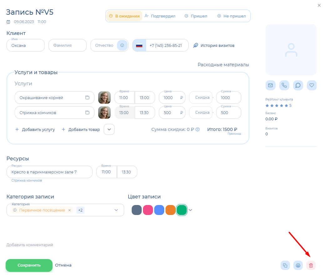 Чтобы удалить визит, нажмите на значок корзины в правом нижнем углу карточки визита.