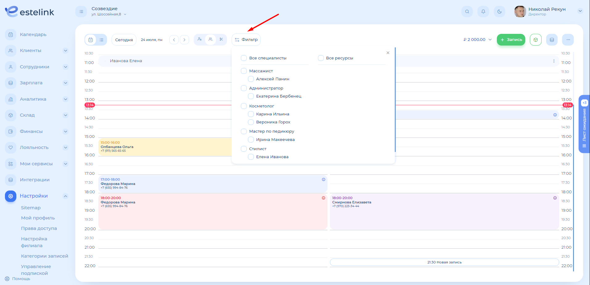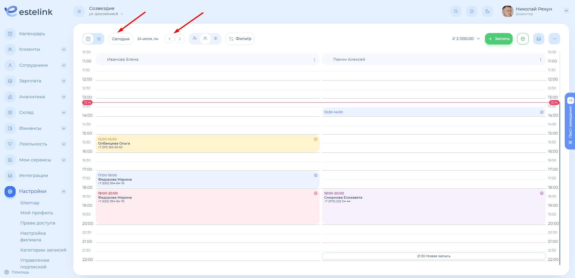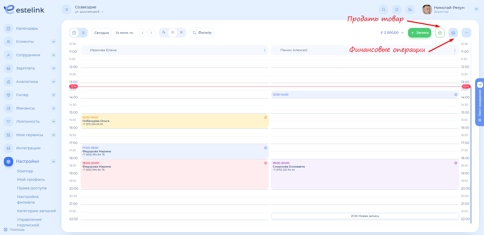Календарь – это основной рабочий инструмент для администратора. В нем можно посмотреть запланированные визиты, занятость ресурсов и специалистов, оформить или перенести визит, продать товар, абонемент или сертификат.