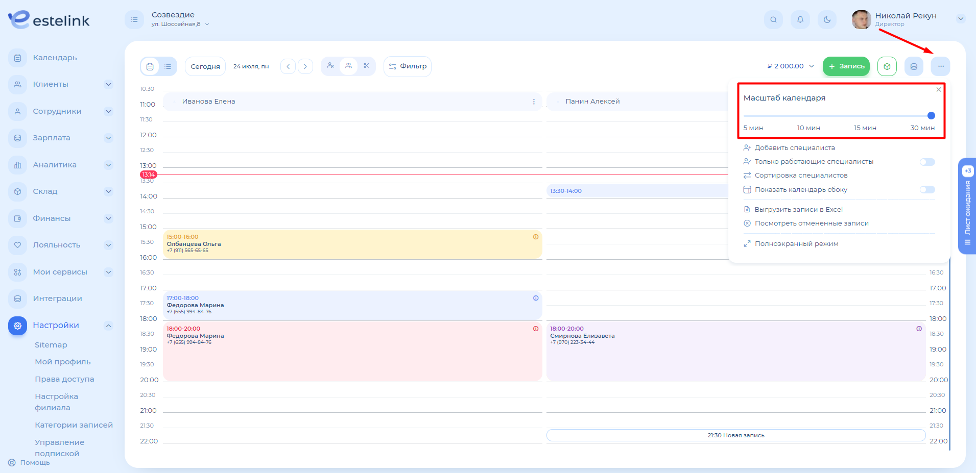 В этом же окне можно настроить отображение специалистов в календаре, добавить календарь в боковое меню, выгрузить все записи в Excel и просмотреть отмененные записи.