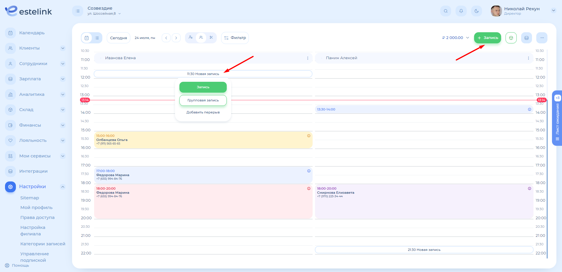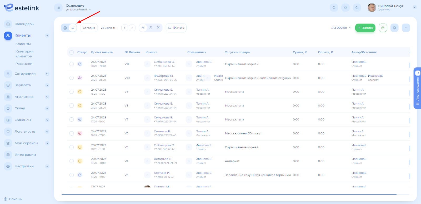Чтобы оформить визит клиента, нажмите на «Запись» в правом верхнем углу, либо на область календаря под именем нужного специалиста. Подробнее об оформлении визита смотрите здесь.