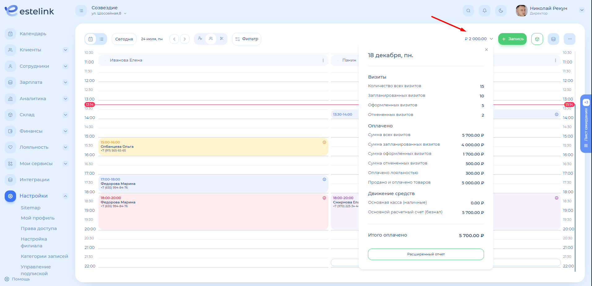 Справа вверху, рядом с кнопкой «Запись», отображается вырученная за день сумма. Нажмите на нее, чтобы открыть отчет по визитам.