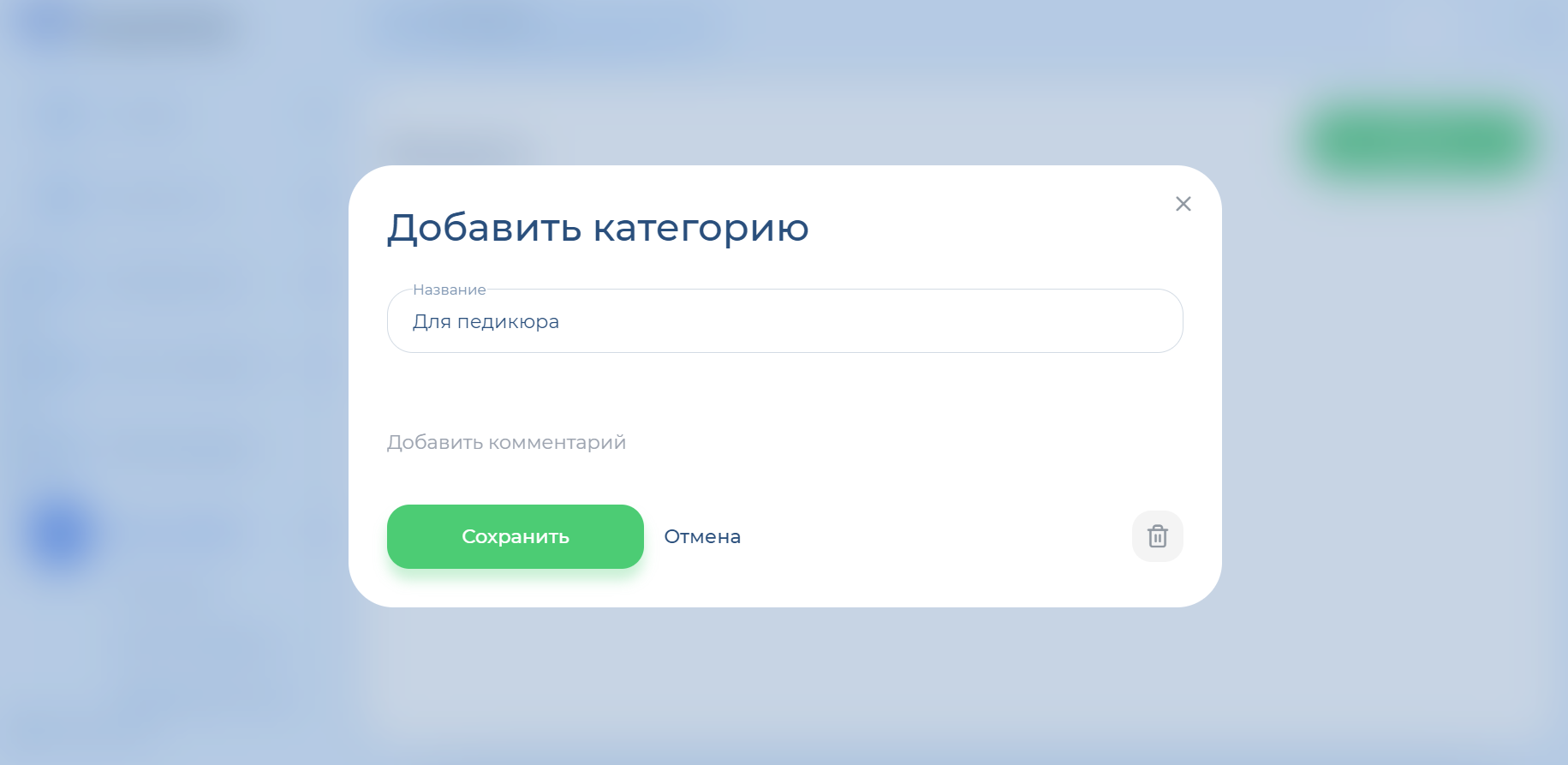 Откроется окно создания категории. В нем нужно заполнить название категории. Придумайте любое название, по которому будет удобно идентифицировать категорию. Например, «Для педикюра». Также можно добавить комментарий для категории.