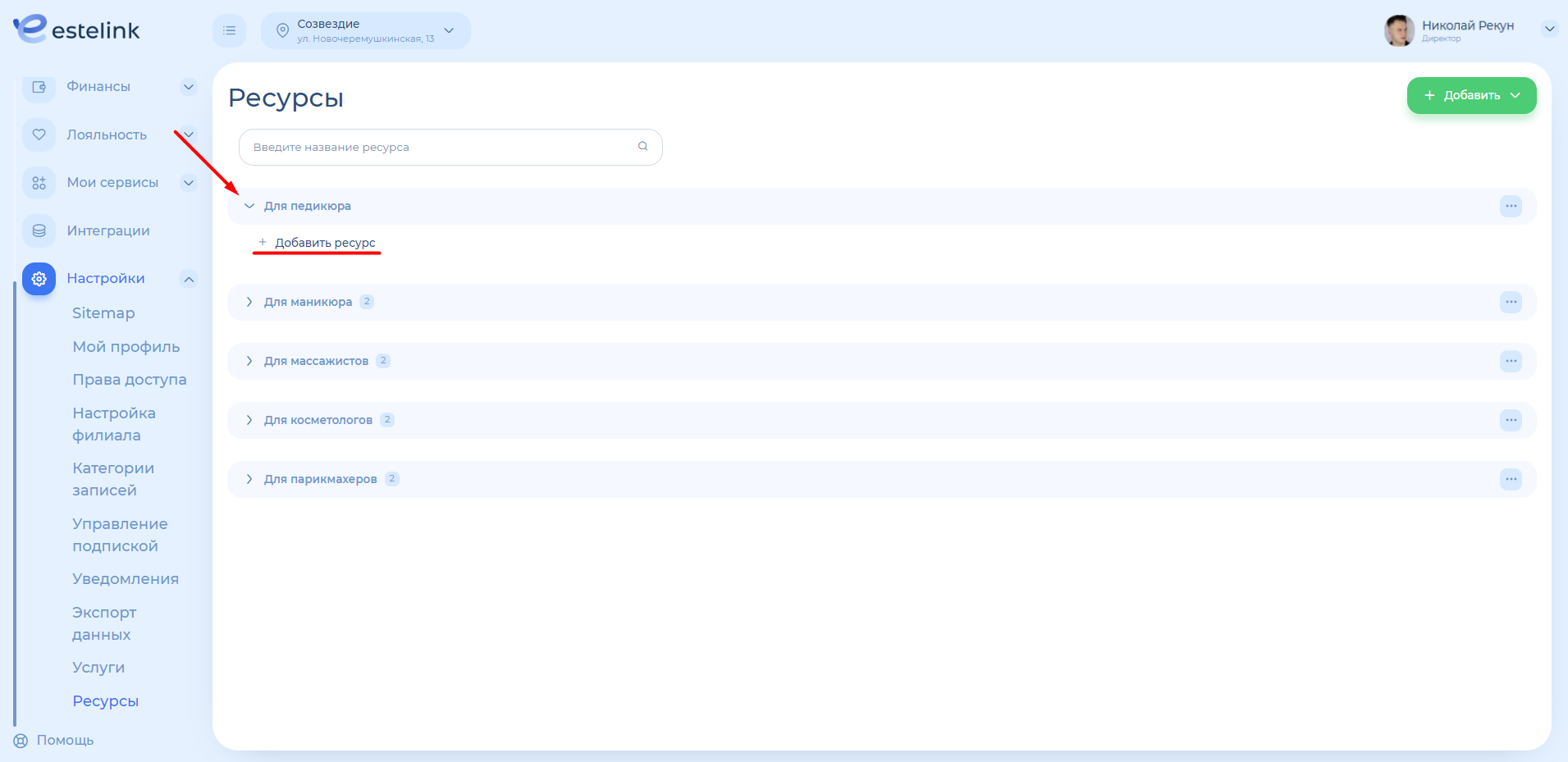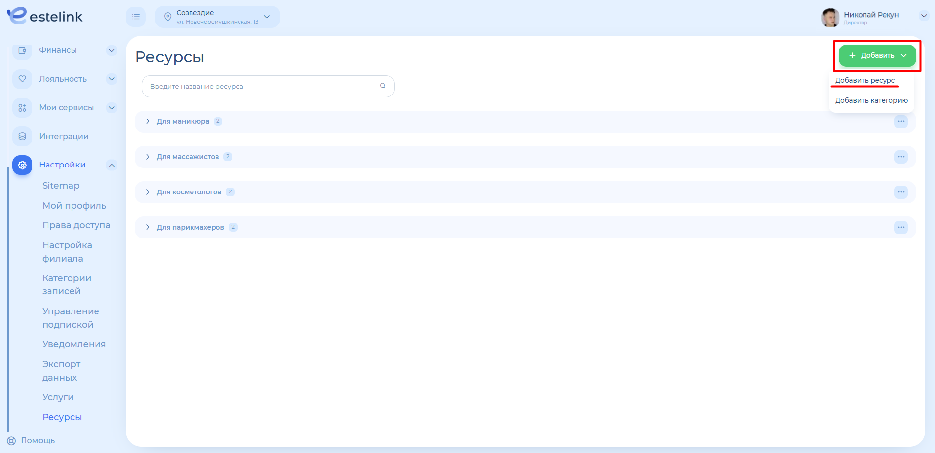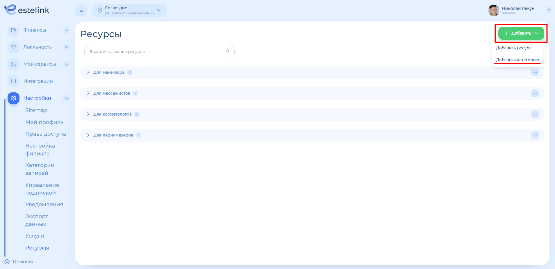 Перейдите в раздел «Настройки» > «Ресурсы» в меню слева и нажмите на зеленую кнопку «Добавить» в правом верхнем углу. Выберите «Добавить категорию».