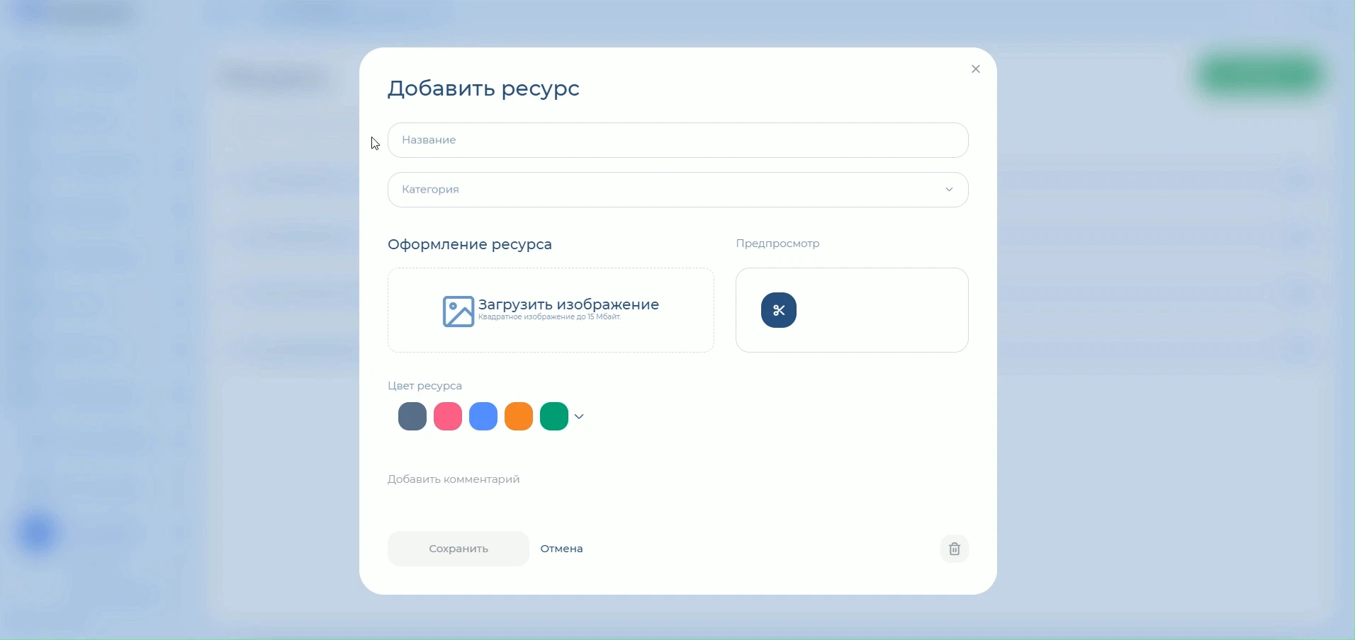 - Оформление ресурса. Вы можете выбрать оформление ресурса: добавить изображение весом до 15 Мбайт и цвет, которым ресурс будет выделен в календаре.