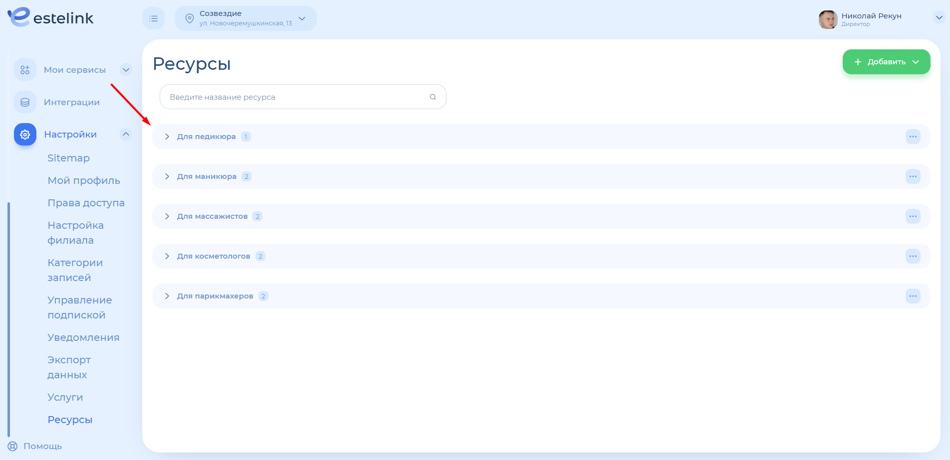 Все ресурсы помещаются в категорию. Чтобы создать ресурсы, сначала нужно добавить хотя бы одну категорию. Например: категория «Ресурсы для ногтевого сервиса», внутри нее ресурсы для маникюра и педикюра.