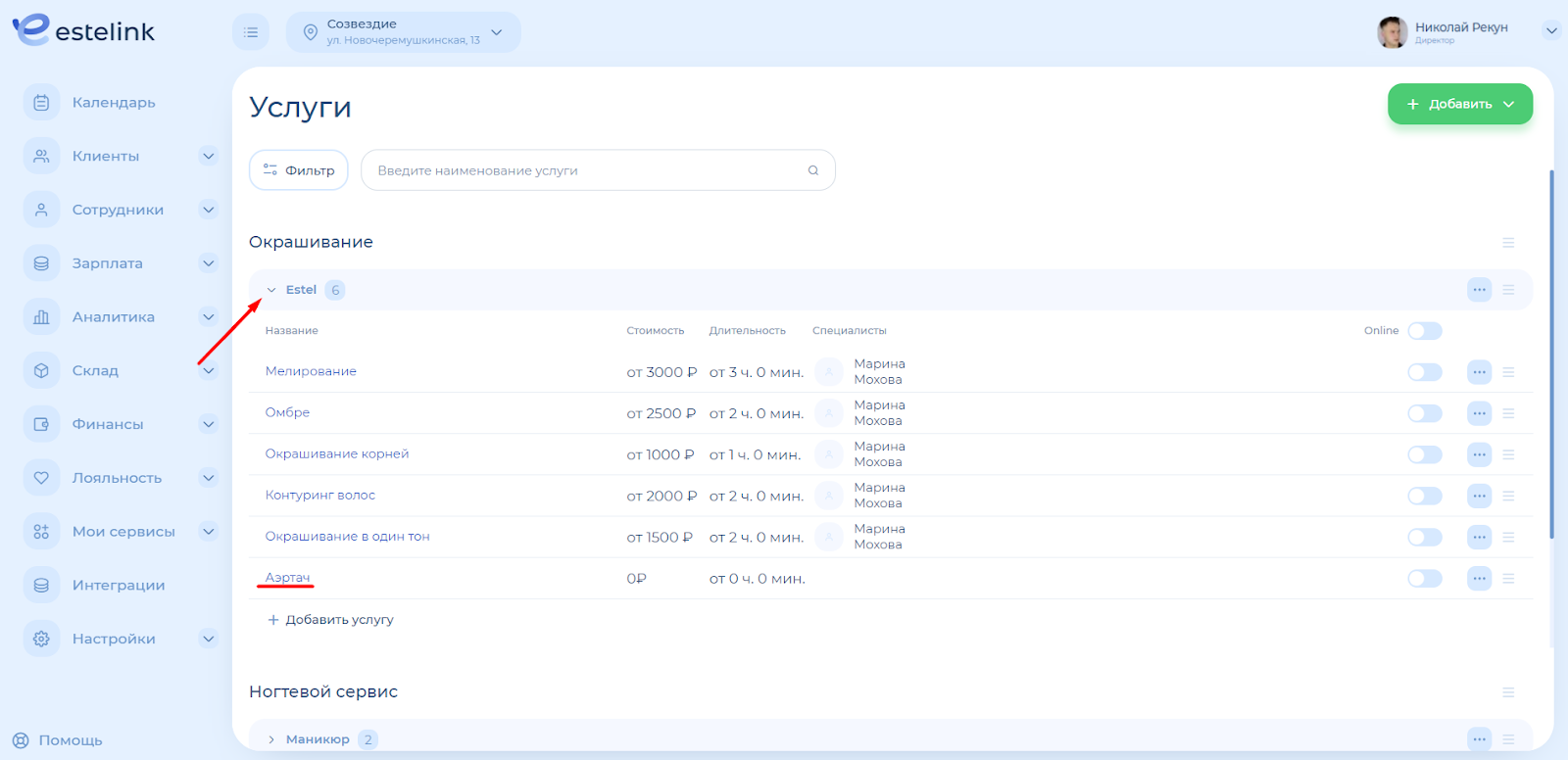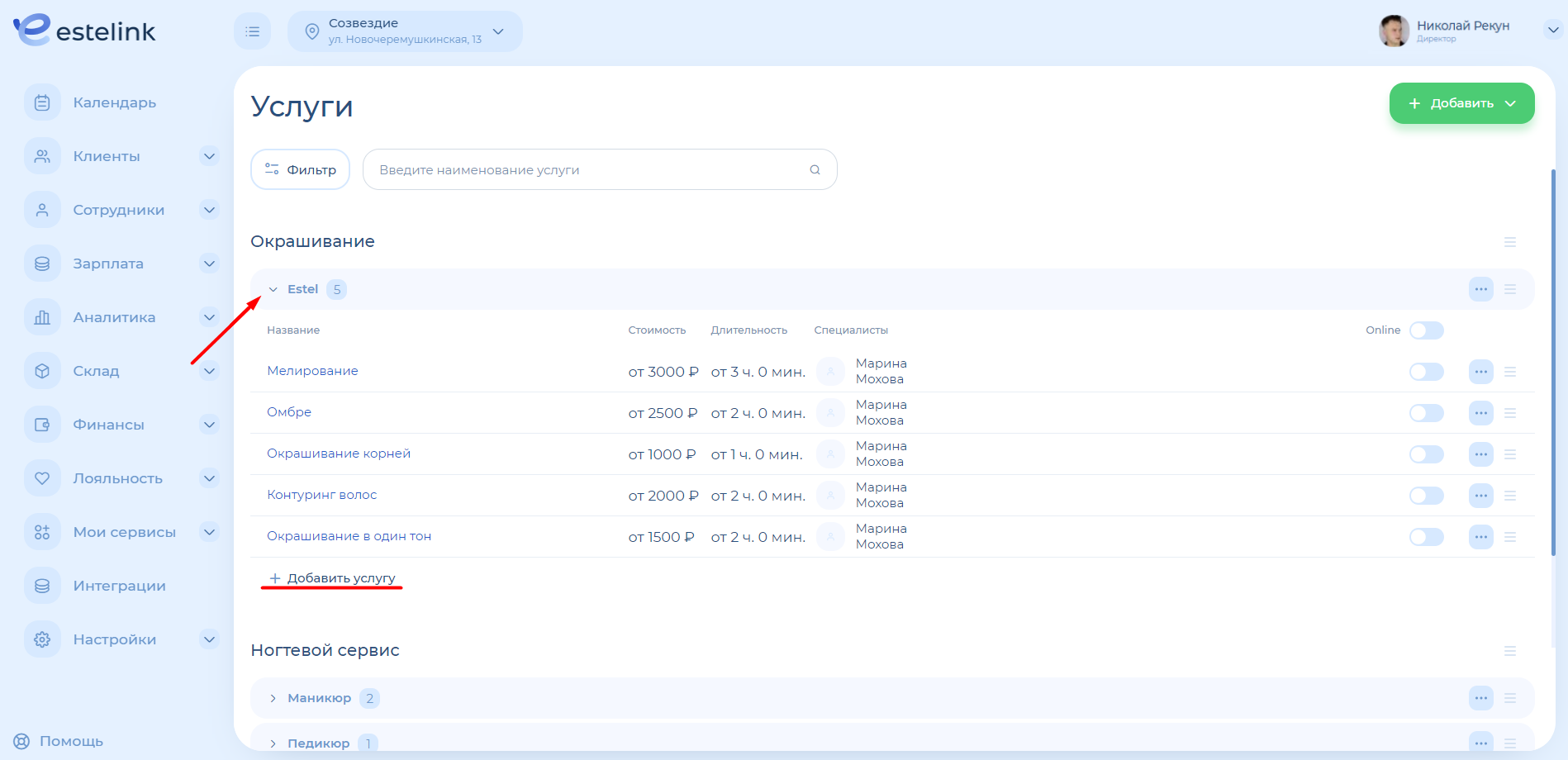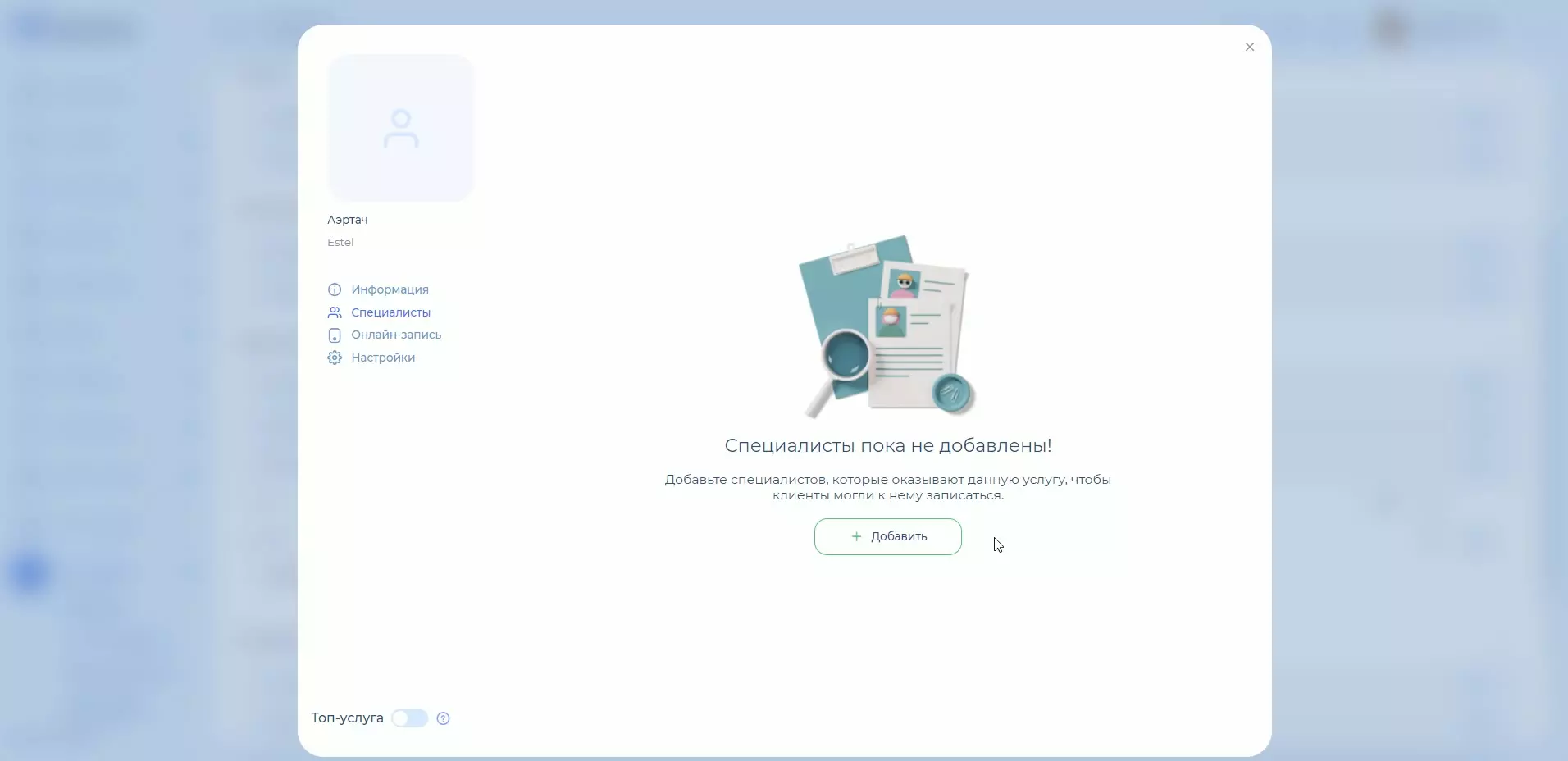 Если специалисты еще не добавлены, создайте их в разделе Сотрудники. Подробнее о специалистах смотрите здесь. Также прикрепить услуги к специалистам можно через профиль специалиста. Подробнее о назначении услуг сотрудникам смотрите здесь.