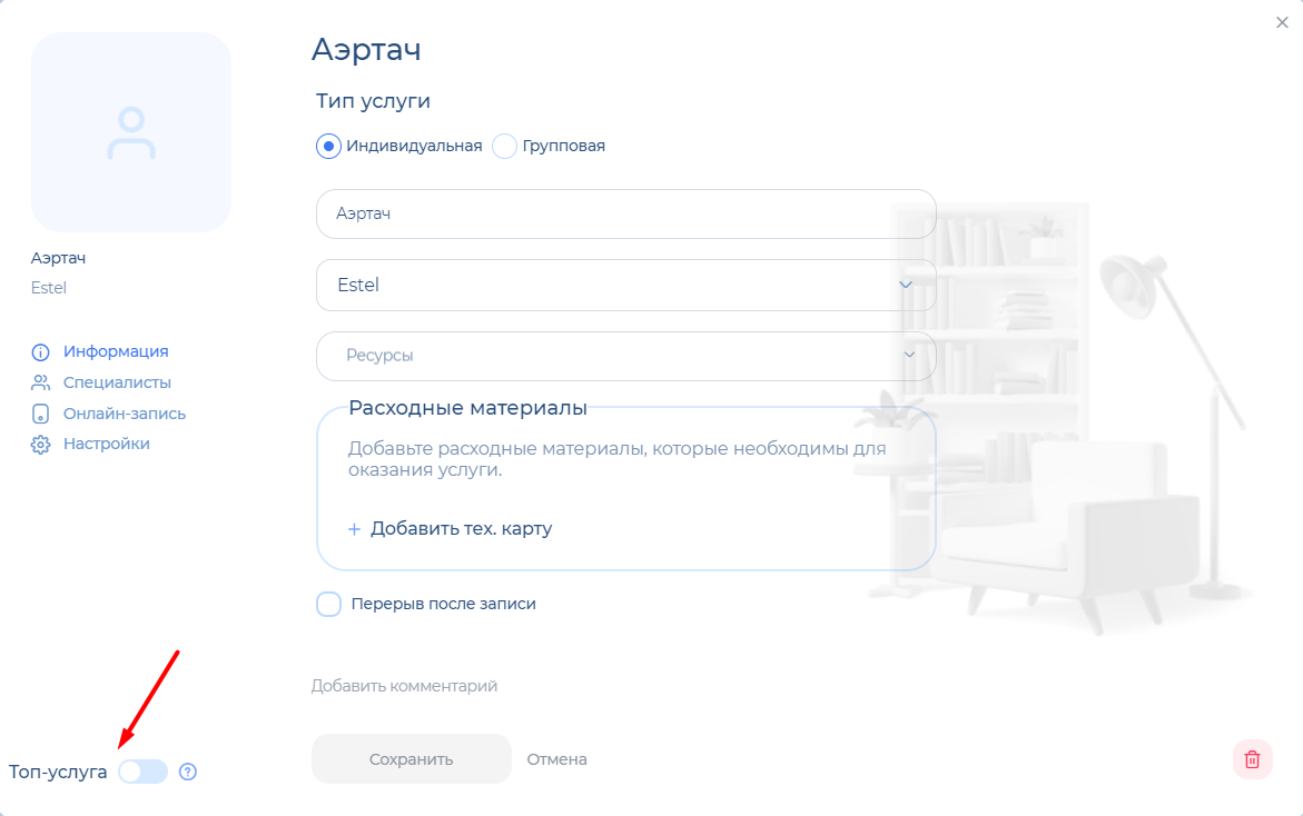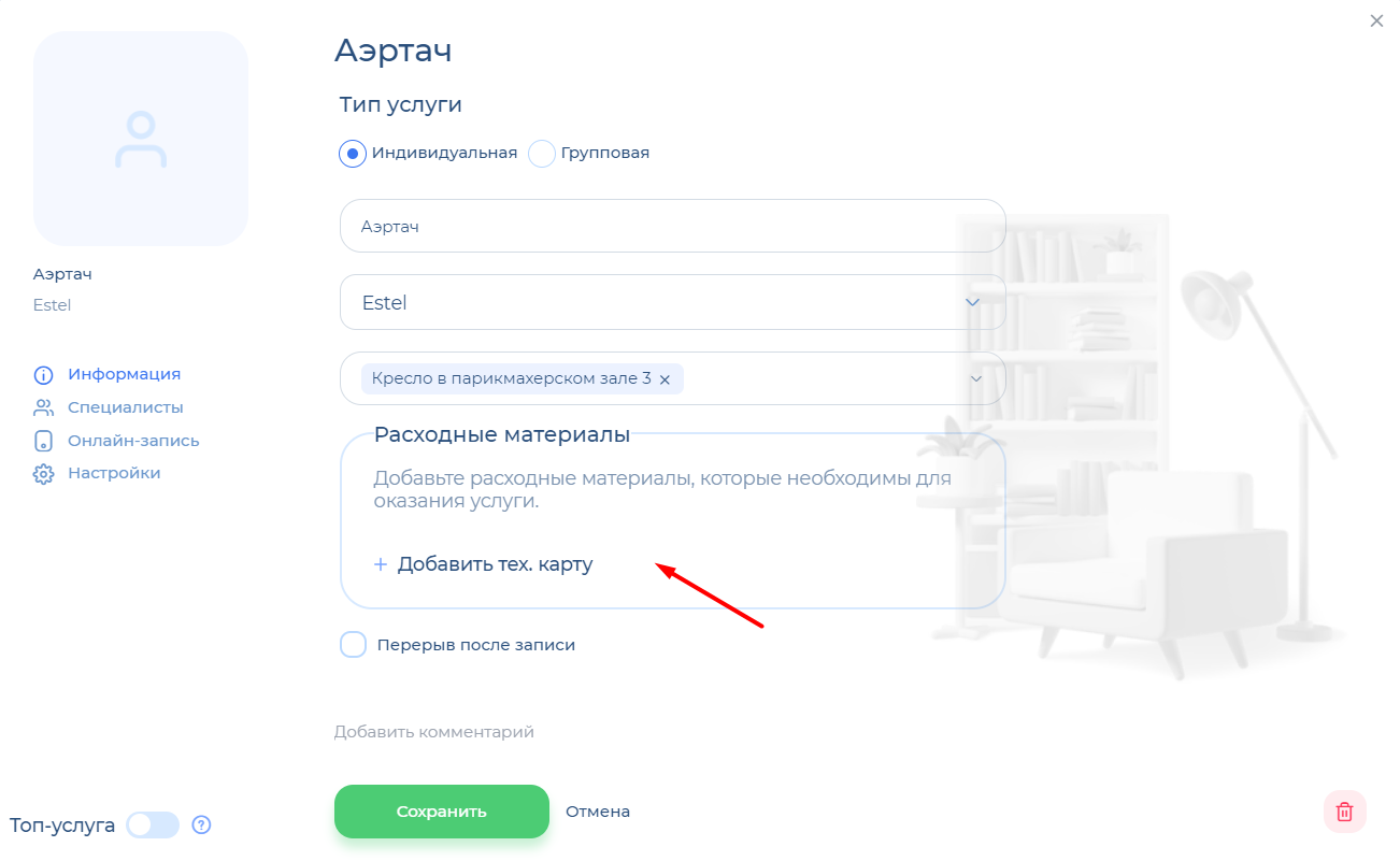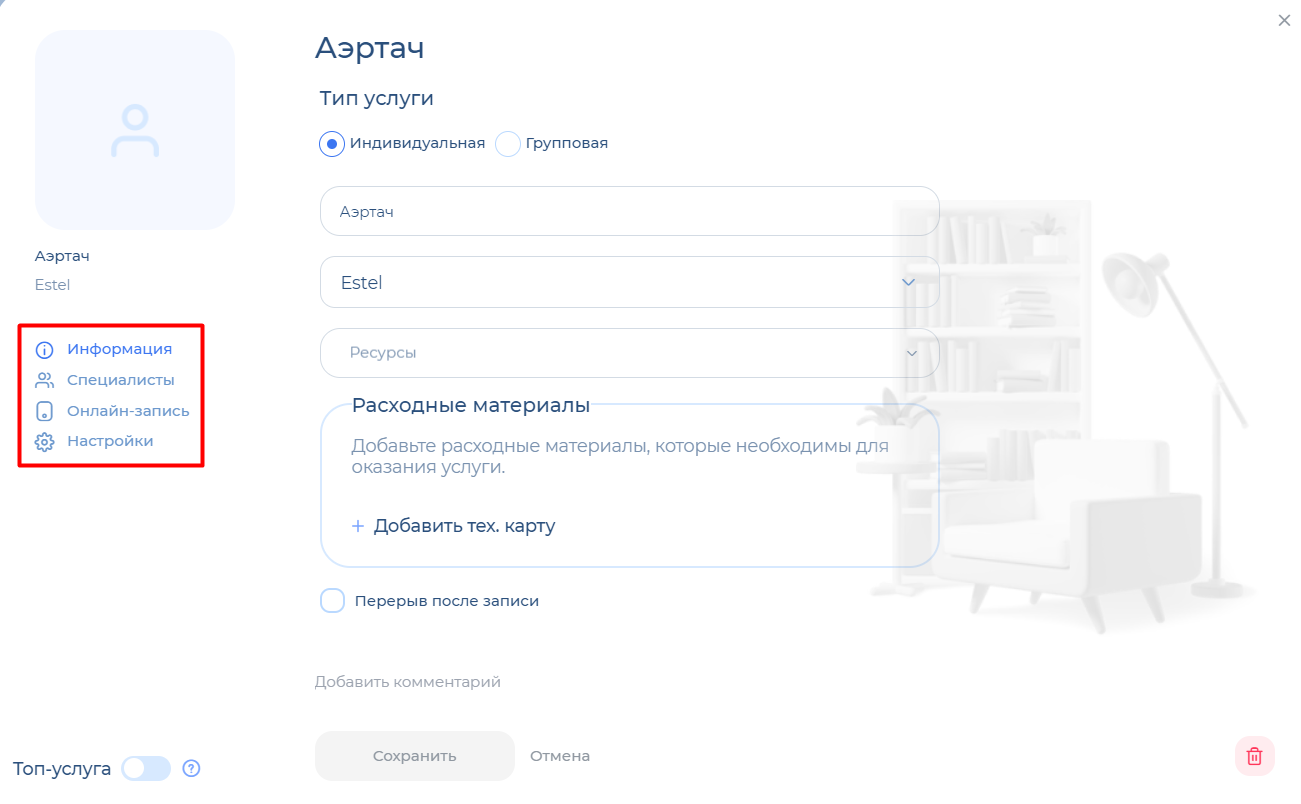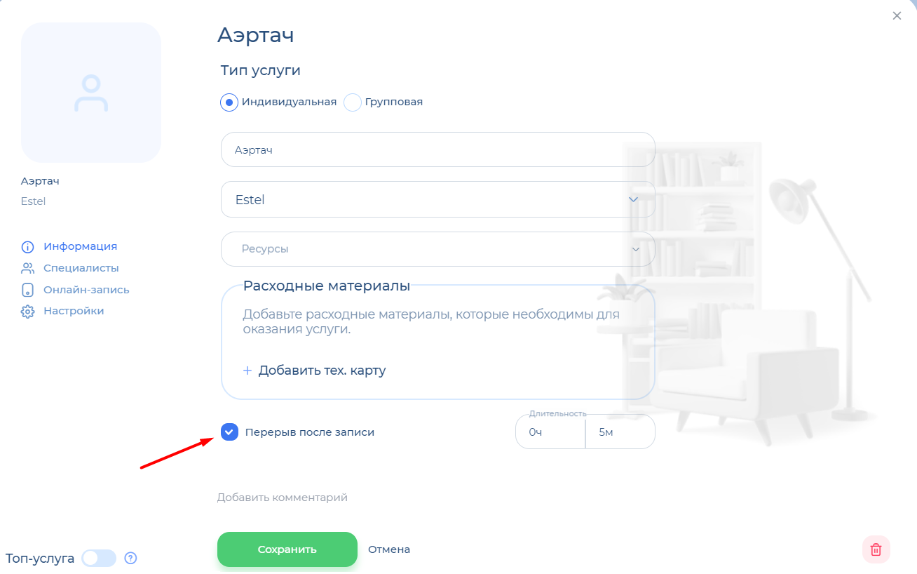 В этом разделе можно добавить ресурсы, материалы и перерыв после записи. Название, категория и тип услуги уже заполнены при создании, но их легко изменить.