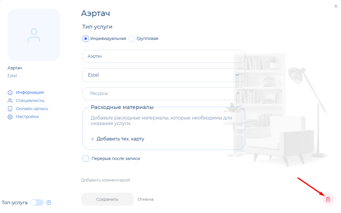 Чтобы удалить услугу, нажмите на значок корзины в правом нижнем углу карточки услуги.