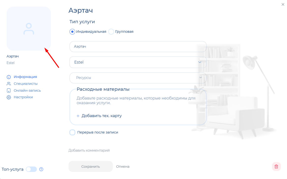 Если вы хотите добавить изображение для услуги, нажмите на иконку в левом верхнем углу. Требования к фото: крупный план, размер не более 15 Мбайт, без посторонних надписей. Пожалуйста, не загружайте картинки из интернета – лучше добавить реальное фото услуги.