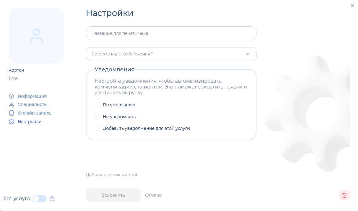 Здесь вы можете задать название для печати чека, выбрать систему налогообложения, по которой оказывается услуга, и настроить уведомления для клиентов.