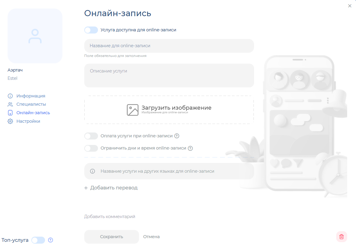 Здесь можно включить онлайн-запись на услугу и настроить параметры для нее: название, изображение, описание, оплата и время записи. Подробнее об онлайн-записи смотрите здесь.