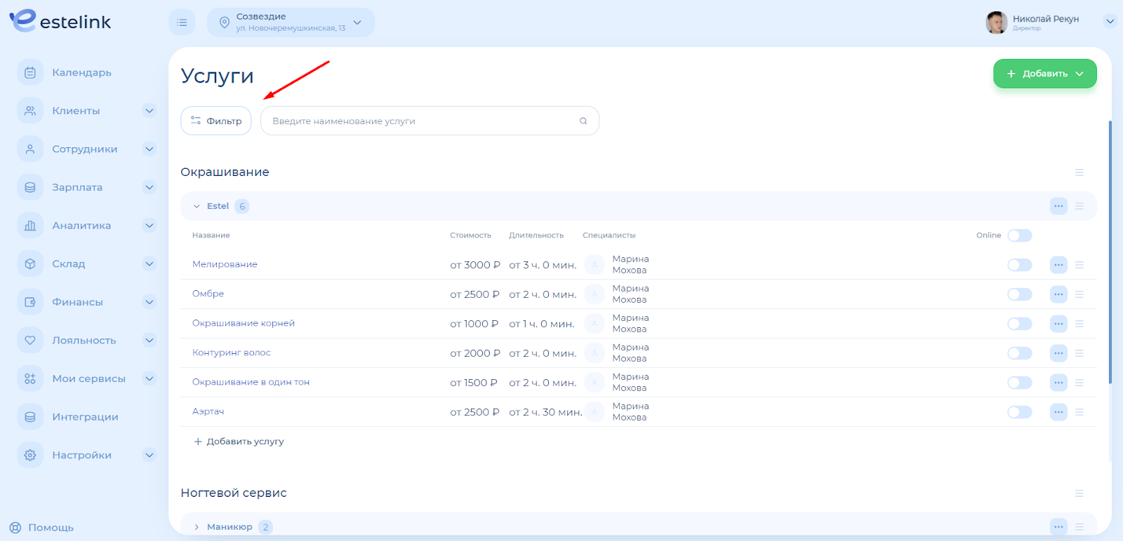 Если в каталоге много услуг, воспользуйтесь фильтром или поиском.