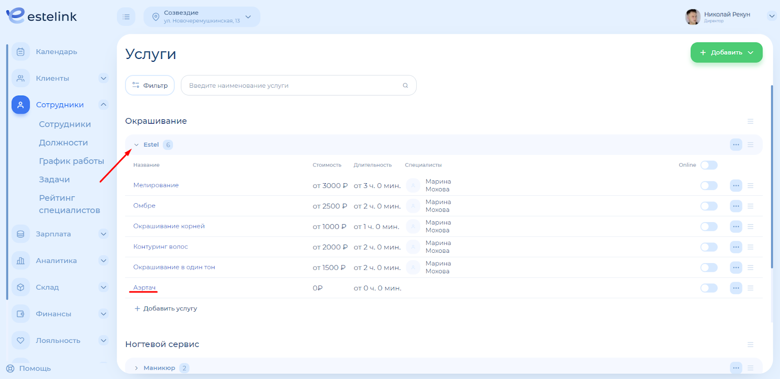 В каталоге услуг содержатся все услуги, которые оказывает компания. Например: стрижки, маникюр, различные виды окрашивания и пр. Визит клиента в календаре оформляется на конкретную услугу, поэтому перед началом работы обязательно создайте услуги!