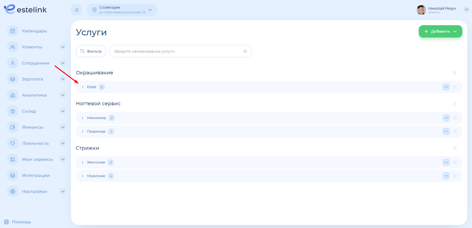 Чтобы раскрыть список услуг внутри категории, нажмите на название категории.