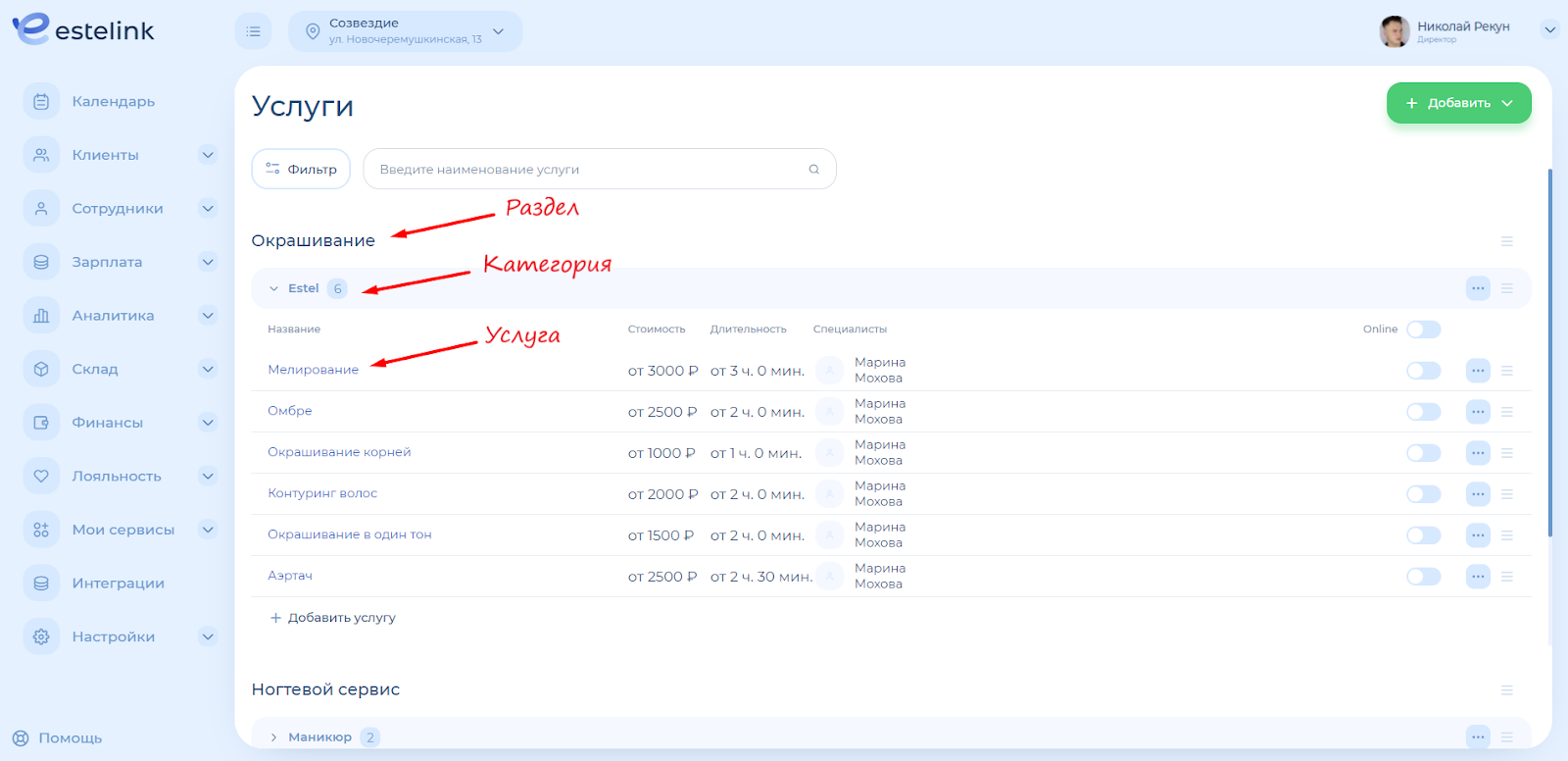 Все услуги помещаются в категорию, а категории – в раздел. Чтобы создать услуги, сначала нужно добавить хотя бы одну категорию и хотя бы один раздел. Например: раздел «Ногтевой сервис», внутри него категории «Маникюр» и «Педикюр». Внутри категории «Маникюр» услуги по маникюру, внутри категории «Педикюр» услуги по педикюру.