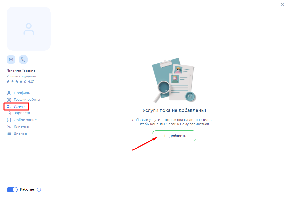 Перейдите в раздел Сотрудники» > «Сотрудники» в меню слева и откройте профиль сотрудника, который оказывает нужную услугу. В профиле откройте раздел «Услуги» и нажмите на «Добавить».