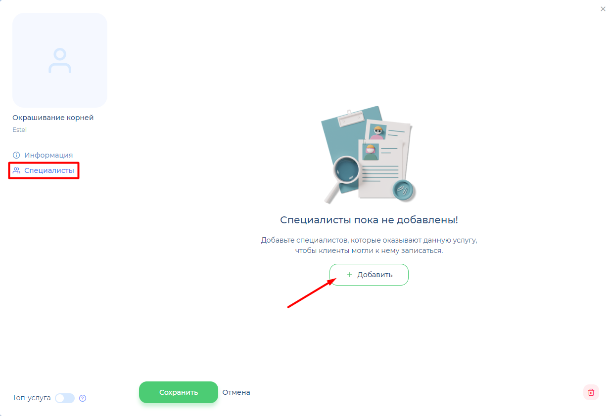 Перейдите в раздел «Настройки» > «Услуги» в меню слева и откройте карточку нужной услуги. В карточке откройте раздел «Специалисты» и нажмите на «Добавить».