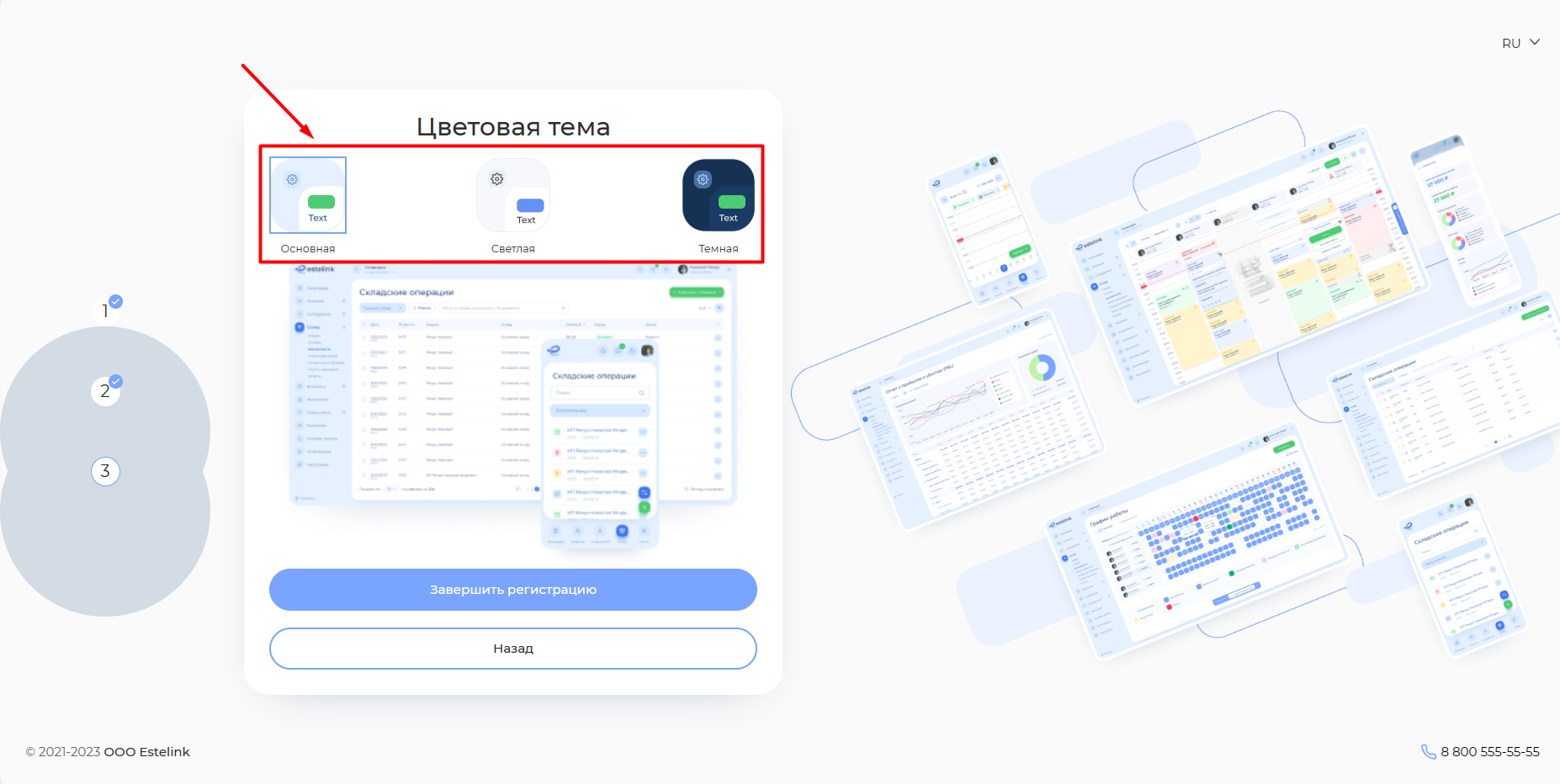 В Estelink есть 3 темы на выбор: основная, светлая и темная. Выберите тему, которая вам больше нравится. Чтобы переключаться между темами, кликайте на иконки с ними.