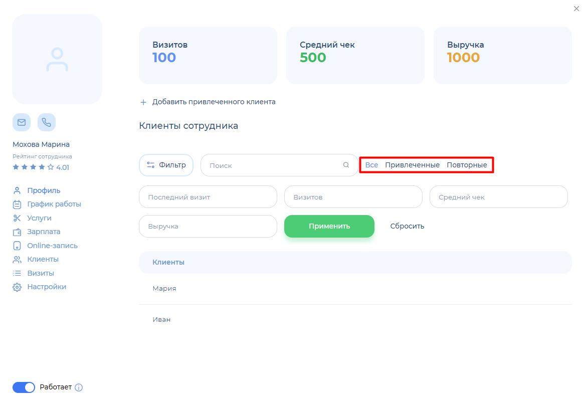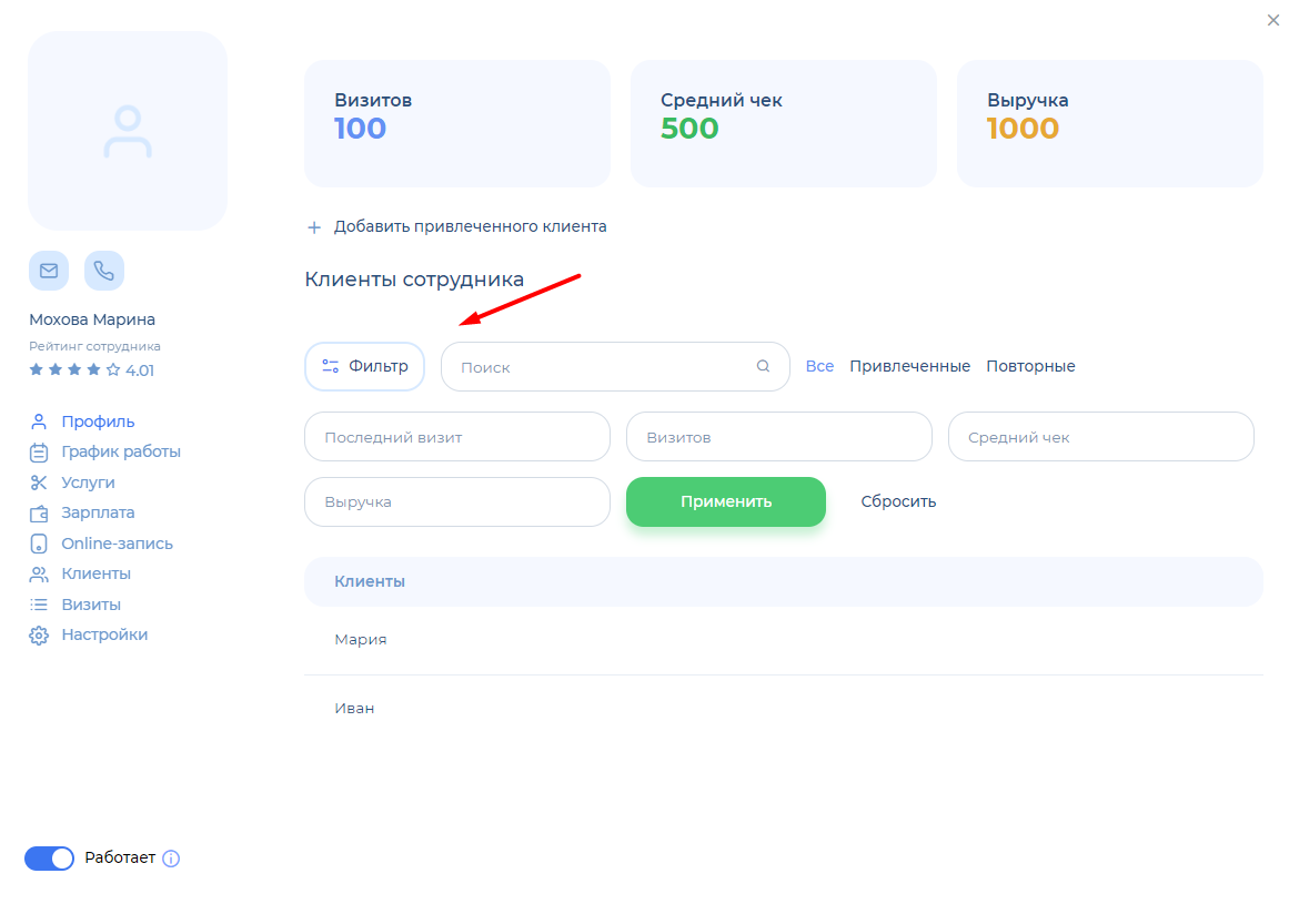 Чтобы посмотреть клиентов сотрудника, откройте его профиль и перейдите в раздел «Клиенты».