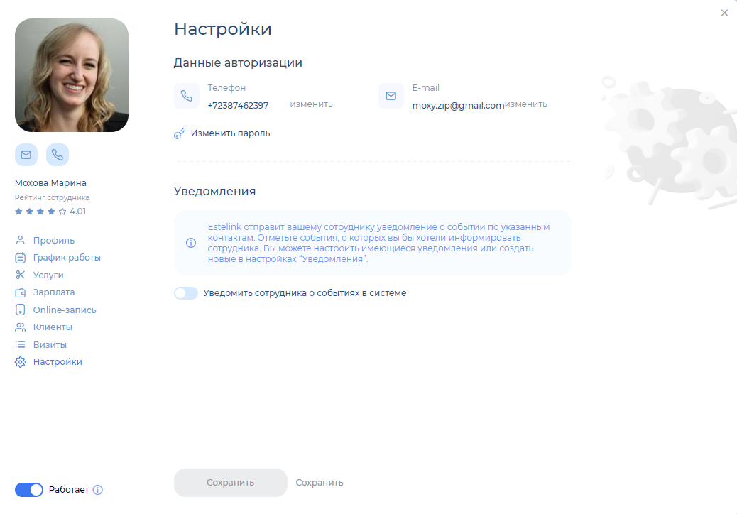 В этом разделе можно изменить данные авторизации (почту, телефон и пароль) и настроить уведомления.