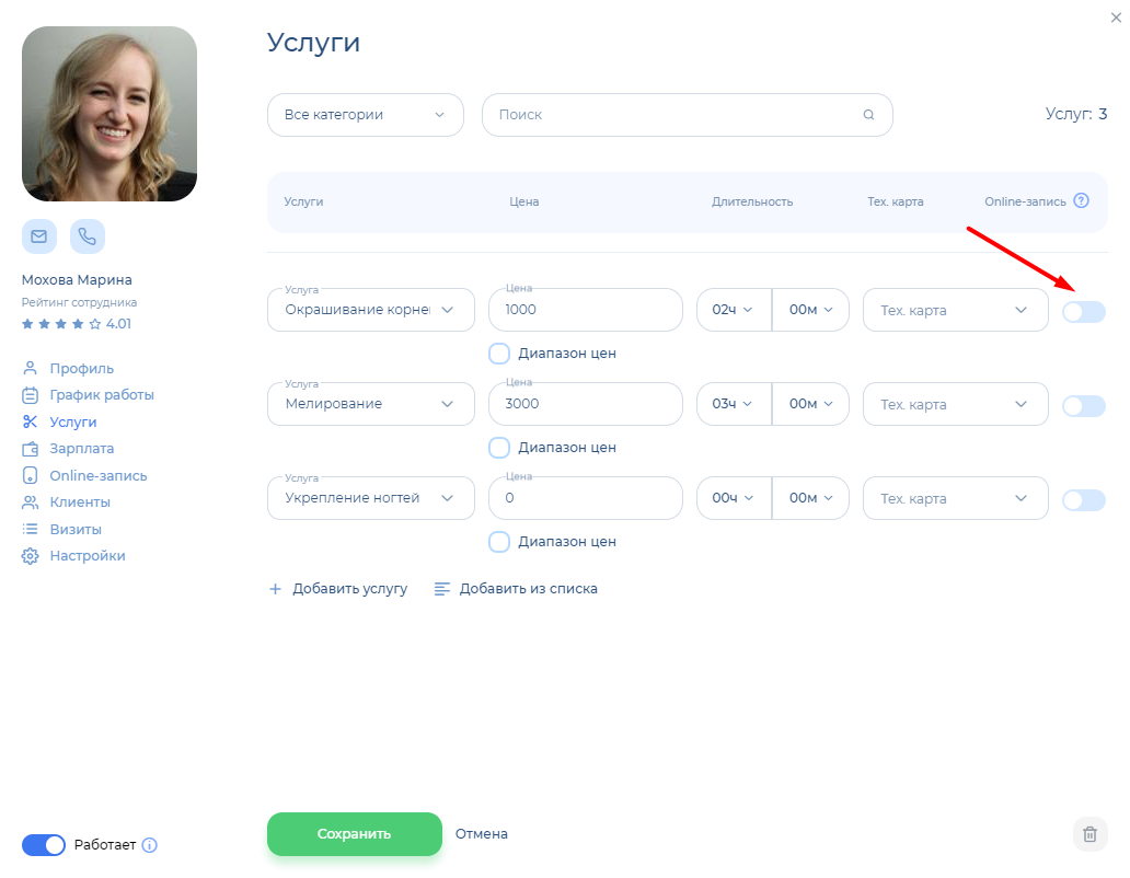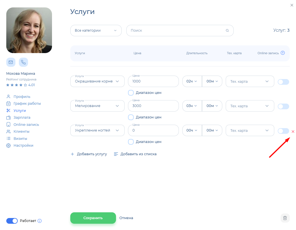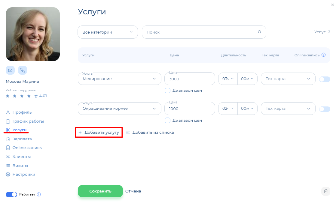 Настройка услуг в профиле сотрудника